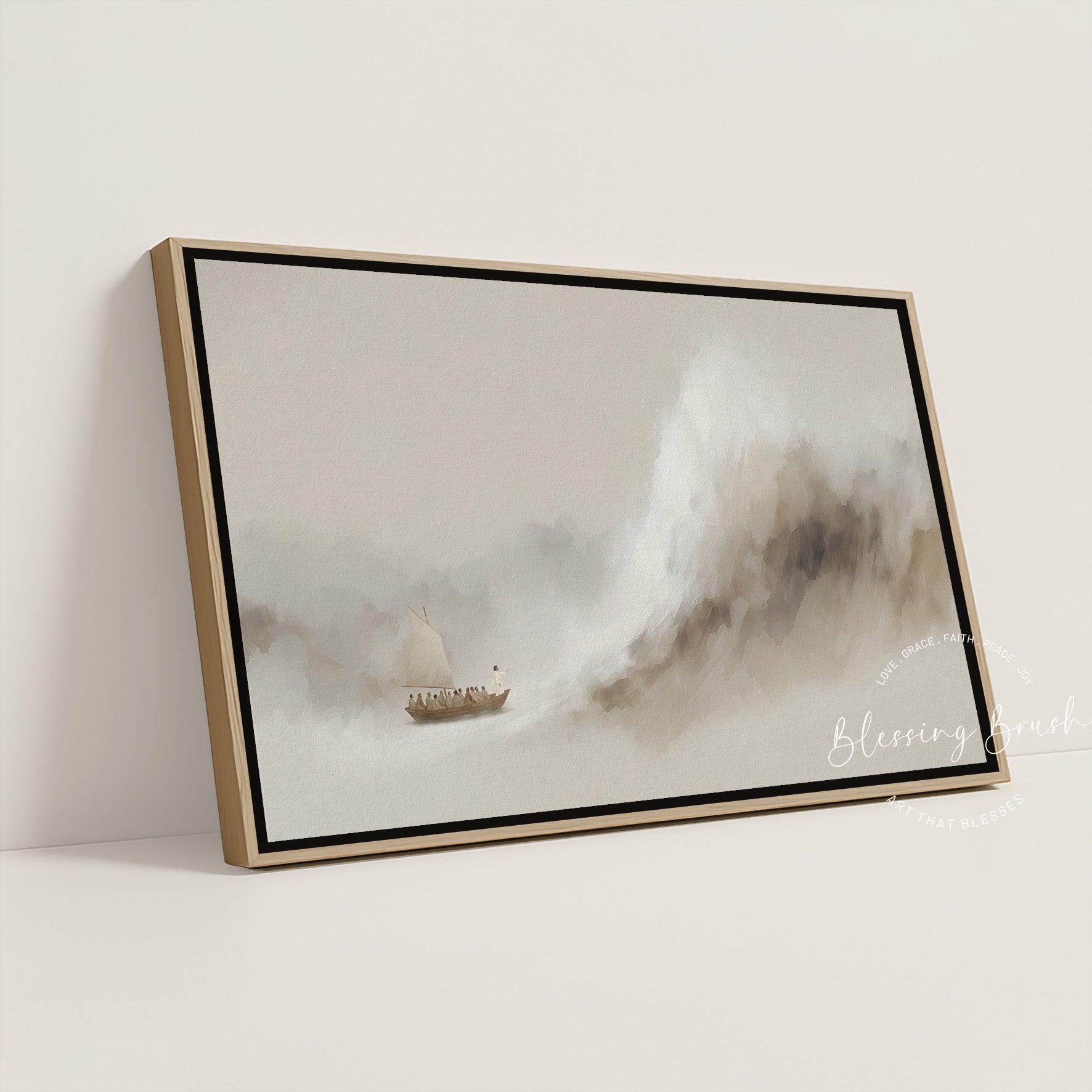 Jesus Calms the Storm Framed Canvas, Peace Be Still Minimalist Beige Christian Wall Art | Blessing Brush