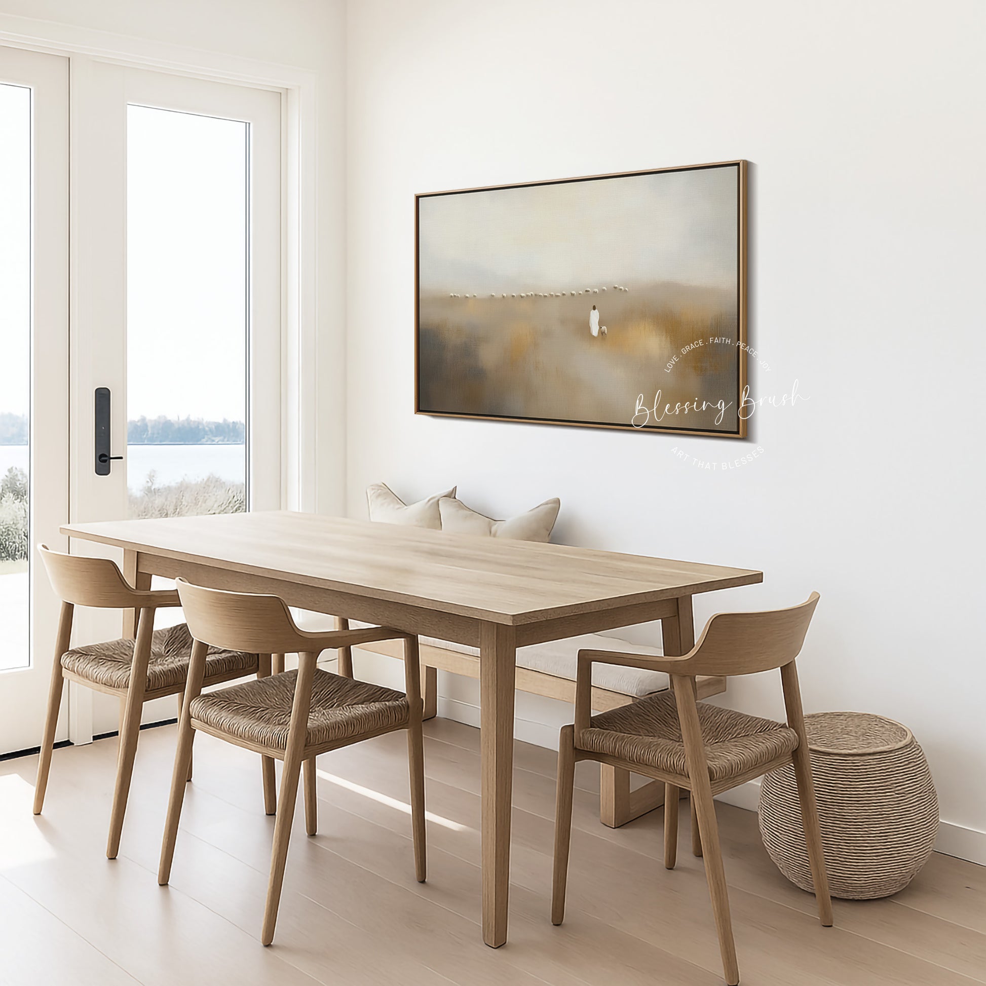 This artwork gently brings to life Jesus’ parable of the lost sheep, reminding us that God’s love pursues us—no matter how far we wander. The peaceful, minimalist landscape and the solitary moment of Jesus with the found sheep evoke assurance, belonging, and hope. Let this piece encourage you every day that you are precious, sought-after, and deeply loved.