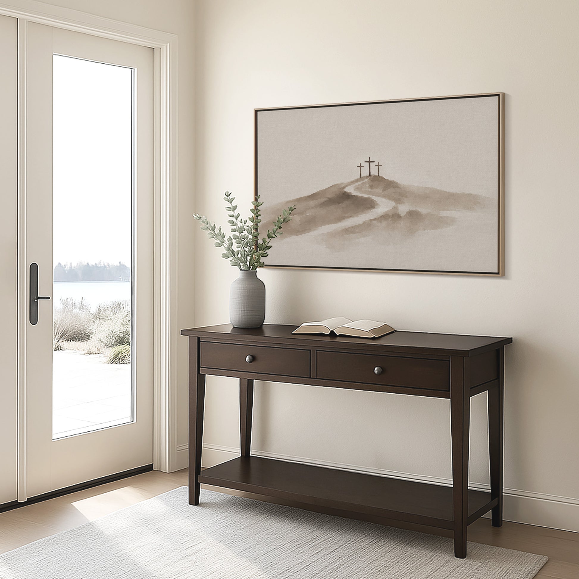 The gentle path leading upward invites reflection: a journey of faith, surrender, and hope. This piece does not shout; it rests. It allows the heart to pause and remember that at Calvary, Jesus gave everything so that we could live free, forgiven, and deeply loved.